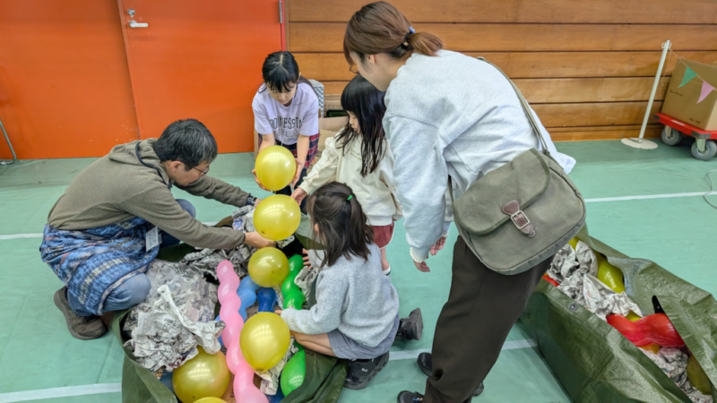 新聞紙を丸めて詰め込んだり、風船も入れたり。そして、寝袋の中に入ってみたら…あたたかい!