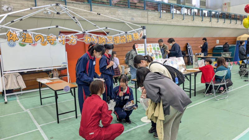 縁あって初回開催から呼んでいただいており、今年は「体温保持」をテーマに「わら納豆寝袋」を体験していただくブースを設けました。