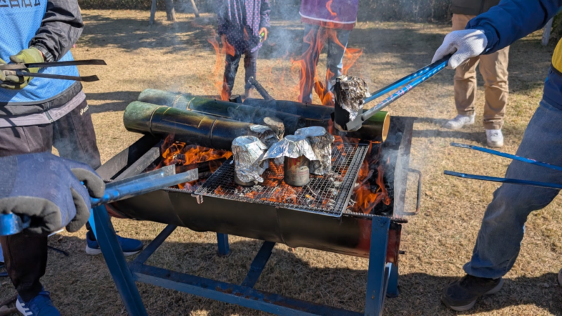去年デモで行った空き缶炊飯にみなさん興味あったようで、今年はグループ毎にチャレンジしてみました。また、会員の方のご厚意で青竹炊飯の用意も!!